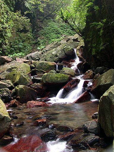 至於從原先涉溪處沿著得子口溪上行將進一步探訪五峰幽谷祕境。越往上走,沿途亂石堆積已無明顯路徑,這是我上回來此未能深入的原因。這回既已有準備,尋路找路若是無路就是溯溪而上,手腳並用攀石踏溪涉水,忙得不亦樂乎。只是沿途溪流石磐以及幽谷週遭翠綠的草木太過美麗,令人不時駐足停留拍照,耽擱了前進的時間。然而就算如此,從涉溪處到幽谷盡頭的瀑布前不過約需15分鐘而已。