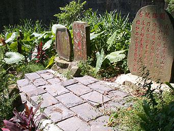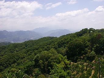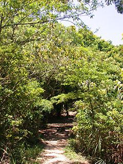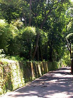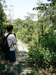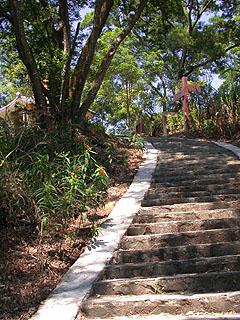 從觀日坪叉路口回到代勸堂都是石階步道。相思樹依舊青綠頗有可觀。第二涼亭附近是飛鳳山的基點(發揮想像力一下)。第一涼亭是新竹八景飛鳳夕照的所在。然後一直下到代勸堂接上柏油路。過雲谷寺之後,從GPS 上查明回到牌樓的路,於是一路往下,兩旁都是高大的樹木,這時才有風吹過來,正覺得清爽無比之際,突然不遠前方喀啦一聲,一堆殘枝被風吹斷從樹梢直落在地,如果再差個十來步,也許就會直接砸在我們頭上。真是好險。