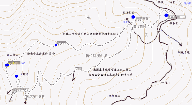 今天的重點行程都在中午的飛鳳山了,只是因為在芎林吃過中飯之後還不到三點,不想那麼早回台北,念頭一動,於是就往兩個月前只走到高頂農莊的橫山大山背山去攻頂了。只是大山背山此次做為我今天午後的額外行程,自也無須為它賦予特殊意義,單純的就是走山徑,登高望遠,完全符合做為bonus所扮演的角色,輕鬆、隨意,無所得之得,這正是夏日在傍晚登山的最佳活動安排。
