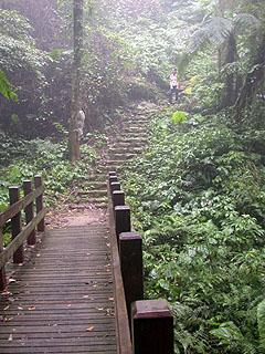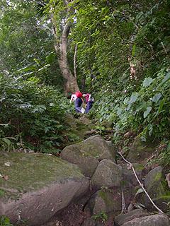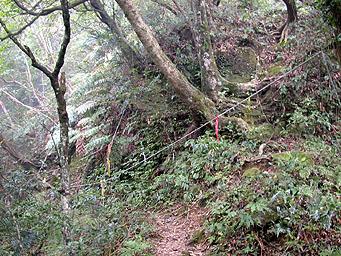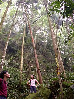 總之這山徑就是陡上,請攤開你的手掌,想像你是一隻小螞蟻從指根部往上爬的樣子。因為這山徑有點小難,所以盤古廟旁的登山口林務局立了告示要人不要在下午兩點上山,因為上到中指峰要兩個小時,如果兩點以後下山可能就要摸黑了。我們上山的時間正好差不多是兩點。