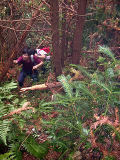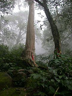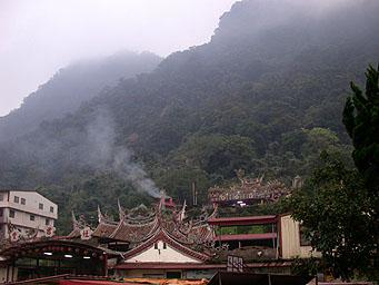 當我們來到中指峰山腳下的灶君堂,天空飄起小雨,不過只飄了一會兒;不過後來上山後才能感覺,如果是下雨最好還是不要硬攀此山,實在是又陡又滑啊。灶君堂似乎有百年以上的歷史,後來又建了上面的盤古廟,不過我今天純粹是為攀登這外型奇特的五指峰而來。說到寺廟,我如果進寺廟去合掌參拜卻不完全是在敬神的,進到廟裡面對我來說就好像是種內心的檢驗..。不過科伯是屬於虔誠的那一種,逢廟必進入參拜。後來在陡上的山徑上,科伯竟然還跟我說這灶君堂比起盤古廟還要靈驗。科伯的意思是他在灶君堂接收到的感應比較強啦(他的腦袋是直達天聽的GPS 嗎?)問他何時開始變得如此虔誠的,他說,自從上次博達股票變成壁紙之後,就學會要去看開了。呵呵,應該還輪不到你這個年薪..萬的竹科新貴來看開吧?像我連買台 GPS或是換掉已經不堪用的Notebook都還要精打細算的說。