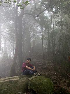 終於上到鞍部之後,在霧中的大石頭上做了個小休息。我覺得左腳膝蓋舊傷處這一兩個禮拜略感酸疼。科伯感應完之後便說用手幫我敲敲膽經就好了,只是敲著敲著竟然從腳一路往上敲到後腦杓去。我說這膝蓋附近酸疼怎麼會跟腦袋瓜有關?科伯說,因為你這氣血一直往上瘀到頭上去了。呵呵,每此科伯給我敲敲打打,總是把症狀說的很嚴重似的。每次給他敲的當兒都覺得痛不欲生,敲過之後又覺得好像果然有點效果。