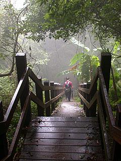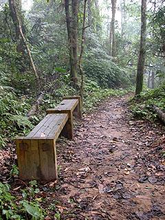 沿途杉林美景不斷,山徑也都比較寬大一些。走到林中一處有木椅的地方,科伯又有感應了。他說此處面向某一個方向很適合練氣功。有一條無形的界線,在界線以左磁場很強,界線以右就沒有。他叫我到兩邊都去站一下試試看看手指是不是有麻麻的感覺。我真的兩邊都去給站過一次。怎麼說呢,好像有感覺,又好像沒有。如果科伯不是在胡說八道,那大概就是我本人沒什麼慧根。
