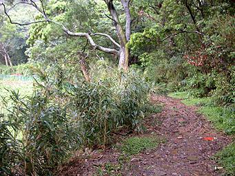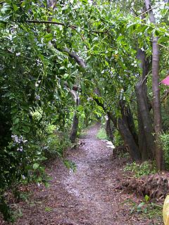 後來繼續往湖底路走時,雨突然大起來了,我們躲進橫嶺古道的樹林中,並在青綠的竹林隧道中疾行。橫嶺古道這片竹林真是漂亮且長,可惜我無法停下來照相,因為下雨,也因為光線太暗。大家都說,真是可惜了這段既好走又美麗的古道,如果沒有下雨就好了。