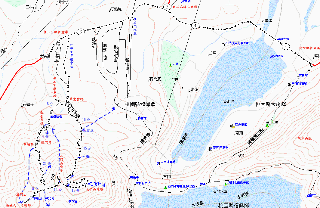 雖然很想這麼做,不過好歹還是交代一下行程。本日規劃先登桃園石門水庫附近的石門山,再回大溪月眉看花。石門山步道系統錯綜複雜,果然是桃園人健行散步的好去處,很多條岔路應該都是逐漸被開發出來的吧。今天登山的起點在台三乙線往龍潭方向的桃園縣勞工育樂中心,從此處可以直上觀音聖像,從觀音聖像在上行約二十分鐘可以來到十字岔路口。岔路口往右約五分鐘可上至一等三角點石門山。在十字叉路口取左約十五分鐘可至太平山電塔。