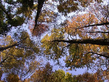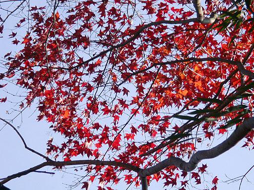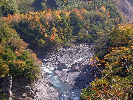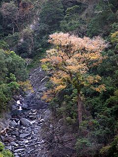 蕭瑟的秋天,遠在新竹深山之中的霞喀羅古道卻很熱鬧。兩星期前我從清泉端進入,賞的是紅似火的台灣紅榨槭。兩個星期後換從養老端進入,品味的是在日光映入楓香林中漫步的悠閒。深秋山林的彩妝在還沒踏入古道之前的秀巒前就能得見。過秀巒吊橋後有一大片楓香林。然而,遍覽紅楓的最佳角度,卻是在遠遠的對岸公路上眺望。換是置身在楓林之中,反而只會侷限在雙眼所及的枯黃。正是不識廬山真面目,只緣身在此山中。
