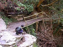 古道雖然在白石(11k)附近崩塌而中斷,不過最棒的楓香卻是在馬鞍駐在所(17k)附近。嚴格來說,楓香林應該是過了馬鞍駐在所繼續往前走,來到另一個大崩塌之前,約16.5公里的地方。而今天大部分的古道「觀光團」都是在走到馬鞍駐在所後便折返了,因此我們才能有幸在這片楓香林中享受到難得的幽靜。靜到可以聽得到楓葉互相摩擦的沙沙聲,不遠處大崩塌處的流水淙淙聲。但如果已經置身在這樣的清靜之中,卻還沒能嗅到楓葉的香氣,仍然算是白走了這一遭。
