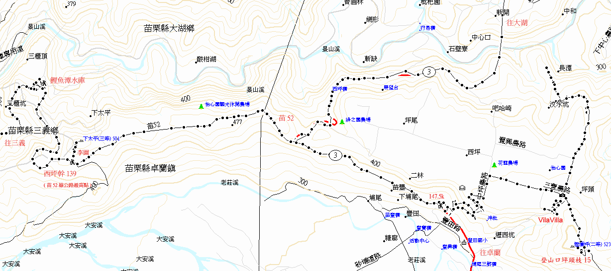 好天氣適合踏青遊園。好友科伯說這次要跟女孩子同行,所以不能一下子去太難的,於是選了卓蘭附近的庭園式餐飲也就是現在很流行的森林廚房,其中一家主打營造印象派概念叫V..。不過冬烘先生豈是自甘同於世俗之人?雖然是看似輕鬆遊園賞花,如果不在附近找個具有意義的山爬爬,總覺得不太過癮。 於是便想順登V.V.附近的壢西坪(三等原點遺失,改聯勤二等測量);然後走苗52線回三義時,順登下太平(三等56號)展望鯉魚潭。盡規劃一些像這樣豪華的登山行程,大概也只有我這種自以為製造浪漫的人才幹得出來吧。