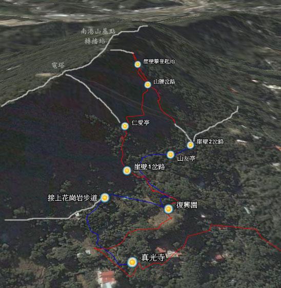 下到復興園再來回望剛才所攀爬的地方。在電塔與轉播站之下應該各有一條攀岩峭壁吧。而這峭壁之所以這麼難攀,是因為從崖壁起登處上到稜線短短的水平距離間,高度落差超過一百五十公尺。由此看這山頭崖壁是很壯觀啦,不過真要去爬它就不是這種輕鬆的態度了。附帶一提的是,天雨路濕滑,我最終還是滑了一跤趺坐在地上,不過幸好是在從仁愛亭下來的石階步道上,但還是震的我鎖骨隱隱作疼,算是提醒我紀念它斷掉一週年。去南港山小試身手,但看來濕滑的岩壁非英雄用武之地。下雨天,還是乖乖待在室內啦。