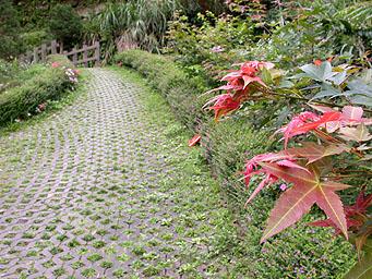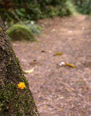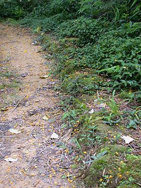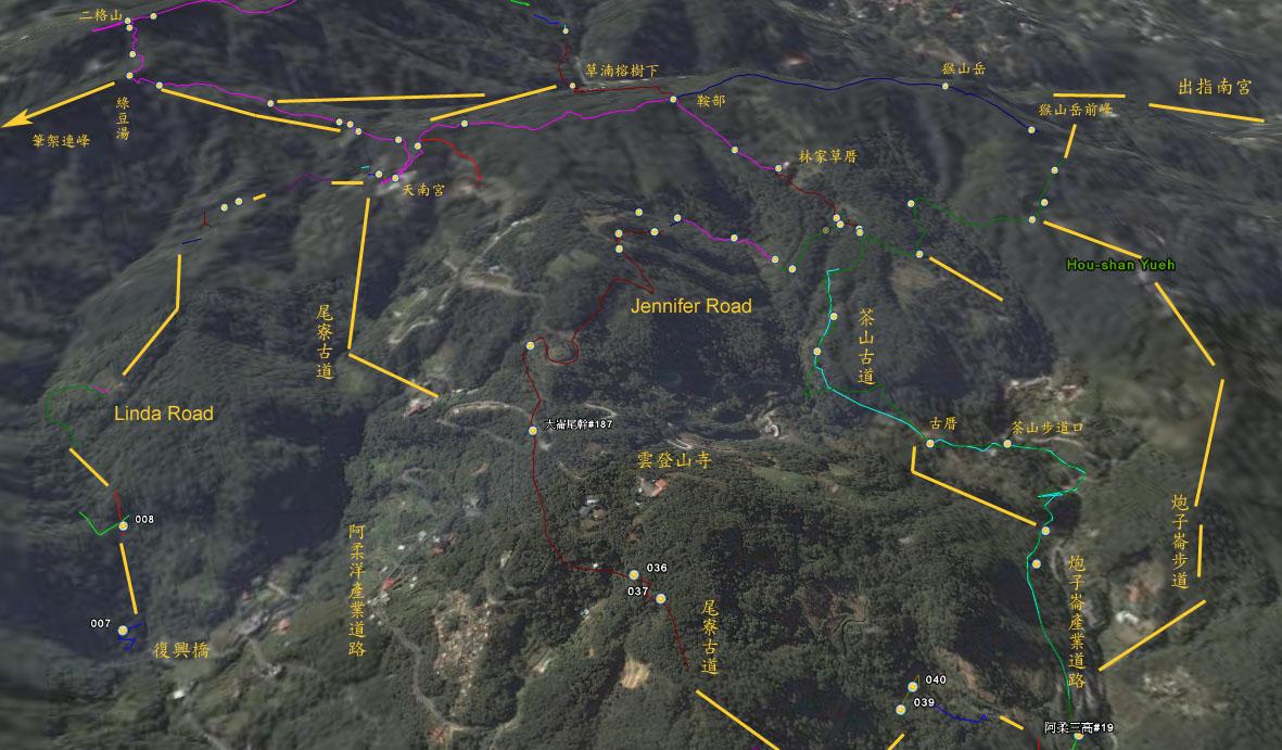 茶山古道上行約30分之後,過大崙尾岔路,在快到林家草厝之前,右邊岔路有明顯指標,標示往指南宮。取右即循寬大山腰路而行,沿途相思黃花落滿泥土山徑,路旁滿是青苔的舊石散發出濃濃古意。此後沿途雖都有岔路,不過原則上都選左路往指南宮而行,右側的路大概都是繞回炮子崙的。