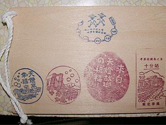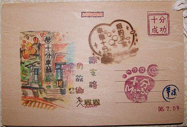在十分車站附近的店裡面,買了一塊近來很流行的木板明信片,然後在上面既蓋章又烙印。煞有其事的安排起到底這些印要蓋在何處才能呈現美感。因為,就算是附庸流俗也要加上自己創意。