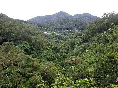 來到貴子坑,今日的登山廊道上倒沒有以往遊客假日絡繹於山徑的盛況。無風之下的持續陡上,揮汗如雨。上到高處的土地公廟展望環抱的山谷。上次上來的時候,前方有一隻五色鳥停在枝頭啼叫,也不怕人。