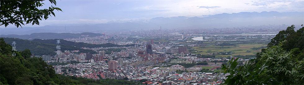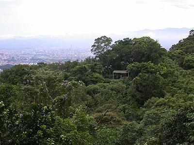 (土地公附近的涼亭展望北投與關渡地區。雨後遠方山腰與平地間有一抹淡淡的雲氣)