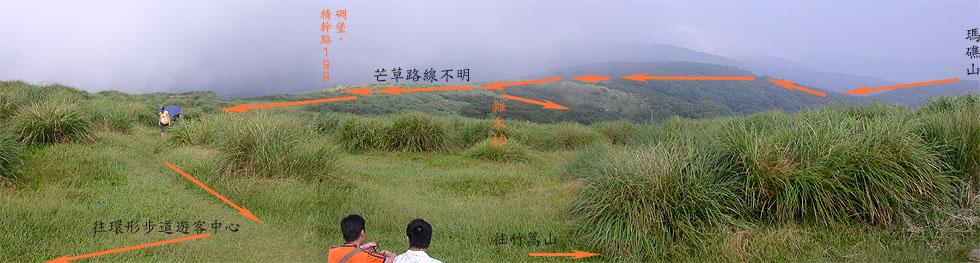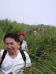 今天的狀況多,包括快中暑,被蜜蜂盯,路程好像比我想像中的要長。好不容易走出樹林之後,原本記得只要鑽一小段的芒草,竟似沒完沒了的漫天覆地,如果換從擎天崗方面過來的,恐怕會很難找得到入口的吧。所以原先好不容易熬了三個小時才走出樹林的朋友們,馬上又遇到從未遇過的芒草叢陣仗。我想他們一定有一種被騙的感覺。因為我沿途一直在說:再五分鐘,再五分鐘就看到大草原了。在第n次的五分鐘之後,終於看到的卻先是難過的芒草堆,苦啊。不過相對的,也就是過程的艱難,因此沿途的每次休息,應該都會感覺到很舒服才對;而且以後一定會更珍惜在冷氣房中的日子,不會再輕易地說要找我幫忙安排減重計畫了。