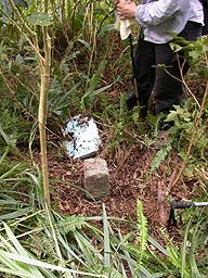 每出到一個彎道,我們必定來一個大休息。從第四個彎道到第八個彎道之間的山丘是小金面山,有之前蕭郎未尋獲的小金面山圖根點。這回眾人都來幫忙尋找,不過在四處雜放金斗甕的樹林間找基點,尤其在七夕前夕,尤其在北宜公路旁,這氣氛實在有點詭異。