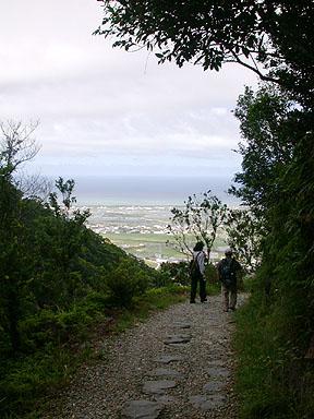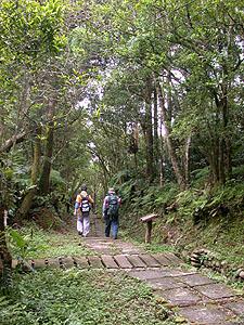 從金面大觀碑往下走,有一段不錯的柳杉林徑,坡度也稱和緩,只是地面上被舖上了易滑的石板。來到上新花園與其他人會合續行跑馬古道。對我來說,說久不久,又是三年沒來了。跑馬古道的精華就在古道轉彎處透過猴洞坑溪谷看見蘭陽平原、蜿蜒如蛇的海岸線、噴雲吐霧的龜山島。傳說中負有秘密使命前來調查此地是否會出真命天子的劉明燈,到了此處看到龜蛇入港之勢,以及背後形如官帽的鴻子山,頗為驚異。但後來又說,還好這官帽的方向反了,也歪了一邊,頂多出些草莽英雄。