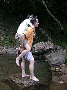 後來來到猴洞坑瀑布頂,時候還早,於是大夥就在瀑布頂上的潭水畔休息等著稍後要幫雨傘大哥慶祝退休。今天後段行程簡單大家心情也輕鬆,兼之下午四時許陽光已無法直射溪谷,瀑布頂上清涼幽靜。悠然眺望山谷外的藍天白雲翠綠大地,水潭依然是水潭,只是不復去年我來時的清澈。臨啟程時,Andy兄背負著大嫂踏水而過,恩愛非常。想到過兩日又是七夕,這幾天都是晴朗好天氣,屆時月明風清,天空中的牛郎織女星也要分外閃耀,有情人自然欣喜相逢,倒是無情之人又該如何自處?