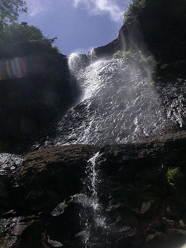 我偏愛看那瀑頂那雲流動極快,天空只在峽谷上露出的一方蔚藍卻還是被那行跡漂浮的雲給遮遮掩掩。於是再來看那瀑布之水彷彿是從天上而來,山風迴繞谷中,那水氣也被帶著隨之飄啊飄,幻化出際遇中不可多得的虹彩..。誰能謂此時此景不具陽明山第一大瀑之格呢?