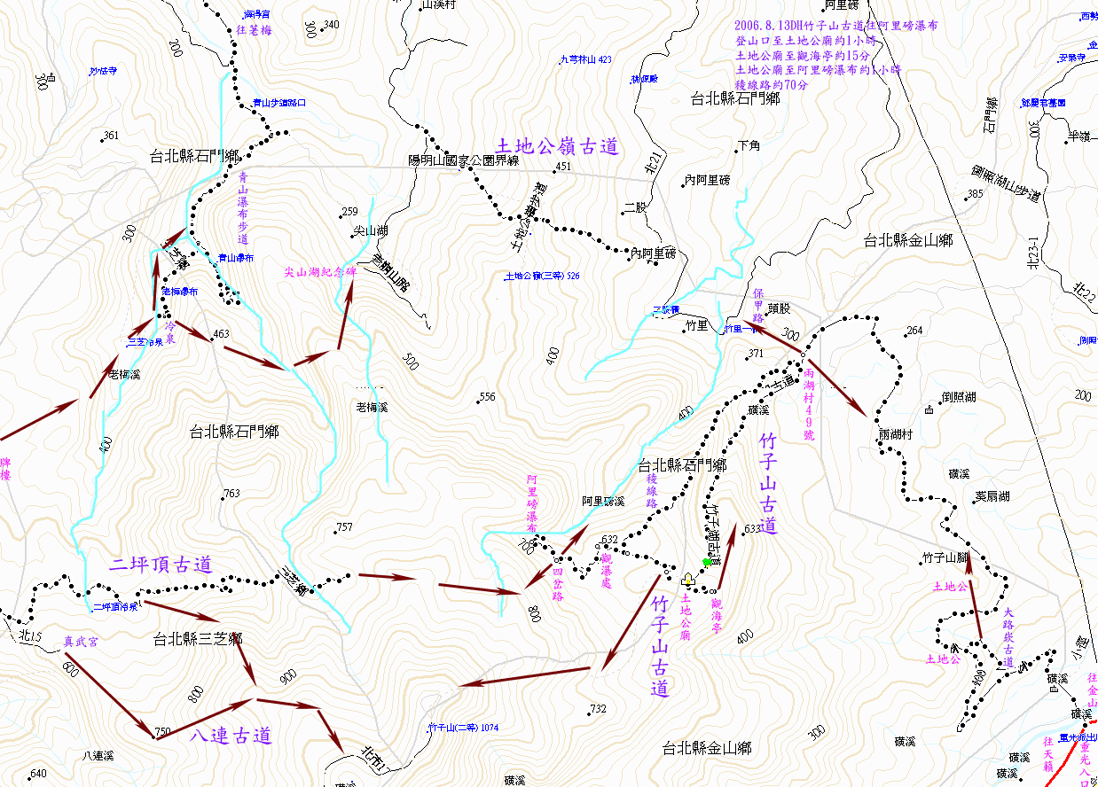 (本圖中土地公嶺古道與二坪頂古道航跡路線參考蕭郎)