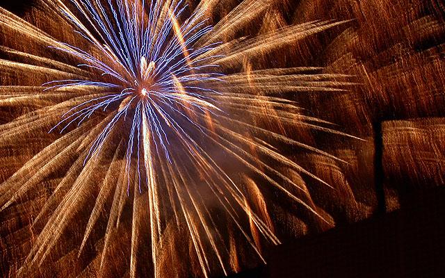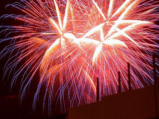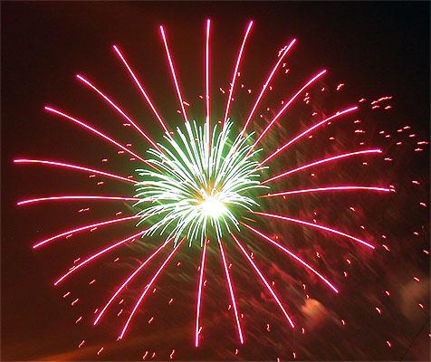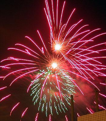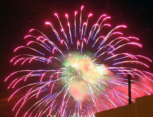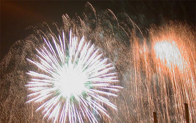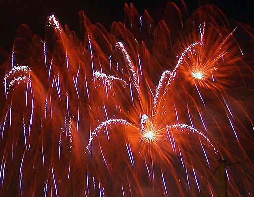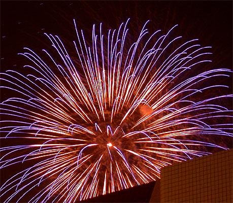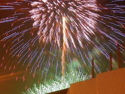第三次拍攝煙火,總算漸漸捉到一些訣竅。還是對焦在無限遠,但是採取快門優先,控制在2~4秒。然後在煙火彈升到空中要爆未爆之前按下快門。4秒的時間足夠紀錄煙火炸開之後大部分奇妙變化。於是在施放煙火的半個小時中,被擋在水門外的數千民眾還是看得興趣盎然,不時隨著意料想像不到的精采煙火表演而驚呼,只有攝影者還是很冷靜的在調整鏡頭角度以及抓對時間按快門。我想再這樣玩物喪志下去,太過著迷於事後所製作出來的影像;會不會總有一天我會忘了其實本應該為當時瞬間的美麗而感動?