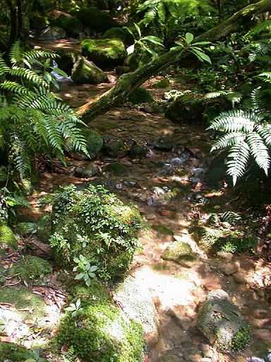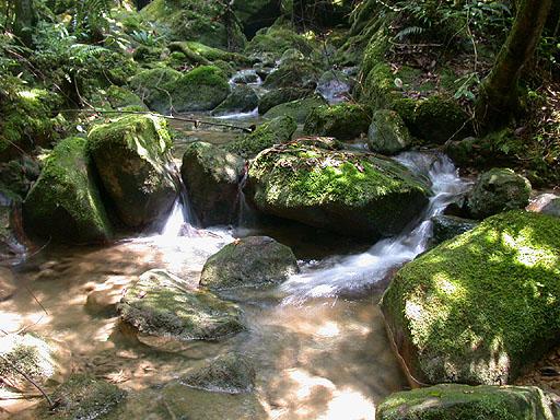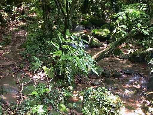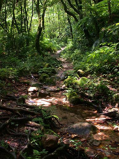 正所謂人有善念,天必從之。我既欲將內雙溪上游的美景拍的唯美,天空就現出正午的陽光了,這時的溪水因為光影投射而略有熱帶叢林的意味。跟哈盆古道比起來,同樣具有溪水潺潺流過林中的雙溪溝古道其實是比較溫馴的小號台灣亞馬遜呢。