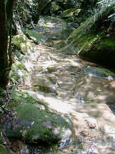 出到五指山公路,但隨即續行雙溪溝古道之支線,不久即聽到步道旁有流水聲,不過天色暗沒光線拍起來不好看。繼續來到兩條小溪會流處,步道被淺淺流水貫穿,溪水繼續往前流過草叢間,頗有幽遠綿延意境。