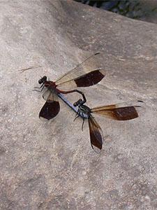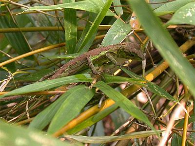沒事,只是覺得這首流行歌的旋律很好聽;如果有人可以陪著一起去旅行一定也很幸福。那我今天的導遊算不算是製造幸福的人呢?哈。總之經過了我最愛的清淺小溪,望著圓滾滾的柚子流口水,不經意瞥見隱身在綠竹葉中的變色龍,最後來到了有一大塊岩石在底下的摩天瀑布。摩天瀑布甚高甚長,我構圖卻只取那瀑水沖激岩石那一段。