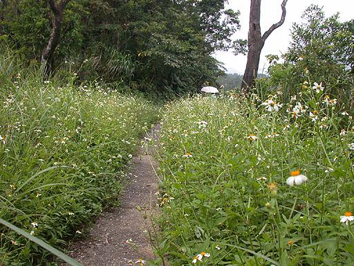 上到瀑布頂就有一條水泥路,右邊可往新寮村出大華車站。這條路會多次跟柏油路交錯。路旁盛開白色的小野菊花 ,有數大便是美的精采,也只有我這等無聊的人才會為它找角度來紀錄它們也曾經如此吸引路人的眼光過。