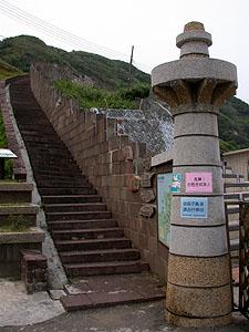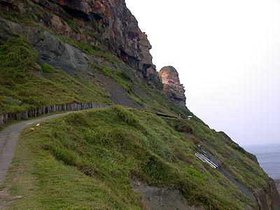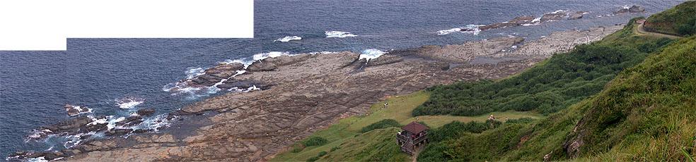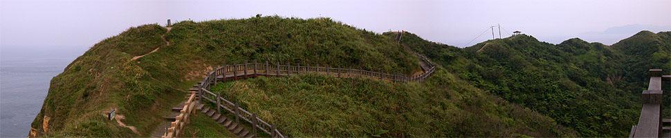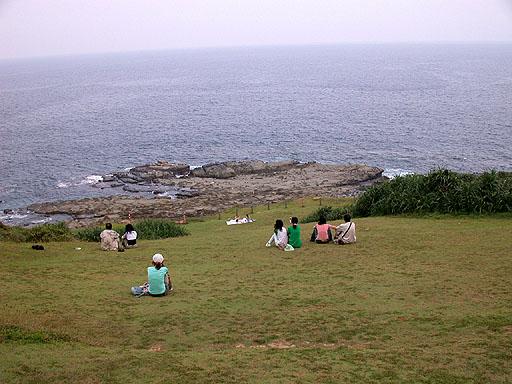 鼻頭角步道導引圖將步道上的涼亭海岸都取了詩情畫意的名字;一時卻也不想記那麼多了。只知道從山谷上到稜線後左邊靠海的邊緣是一座涼亭。涼亭中一對情侶正在逗著小狗玩兒,而從播放機中傳出飄送在空中的音樂是輕快的男女(D&J)對唱,「今天你要嫁給我」。呵呵,靡靡之音有何不好,山沒那麼遠,水也這麼近,緊繃的心情早該放輕鬆,這個時候就是要哼流行音樂,哼著哼著就讓心跟著清風向那悠悠遠遠的天際線飛去。