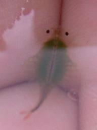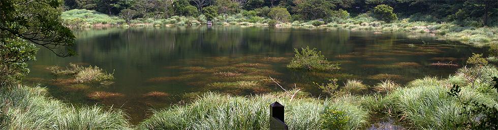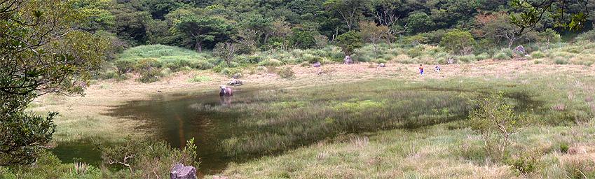 所以呢,雖然此行原來設定的重點金花石蒜不甚精采,但是翠竹林、黃蘭花早就替補了我對美麗事物的渴望。山子頂古道山徑有點長,但是接近山頂之前的溪溝兩旁山坡的楠木林相亦頗為優美,算是繼竹林蘭花之後的美麗事物接力。然後,終於越過向天山火山口緣下至向天池,只是池水已退去大半,論起這時湖面反射的樹林與山景當然沒有可觀之處,不過卻反而可以親近到池畔看數量甚多的向天池特產豐年蝦與黑蝌蚪一起同游。綠色的豐年蝦卻不是蝦,兩排小腳在水中滑動拖著橘色小尾巴的樣子頗為可愛。