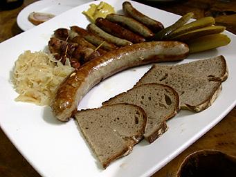 於是八連溪畔Smoking Inn那個挺著大啤酒肚賣豬肉的德國人也熱情加送一盤火腿,順便補上一句:No finish, no go home。直到看見兩大碟香腸拼盤、豬腳套餐端上桌來,傻了眼;怎麼說,這一盤是一人份?