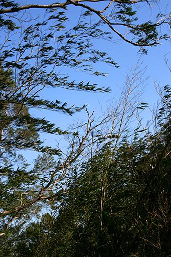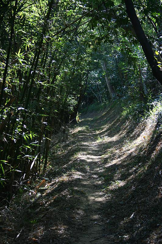 文林古道可以走成一個環形,從等高線觀之,我今天其實就是從左邊這條稜脈上山走到右邊稜脈下來。稜線沿途都是翠綠竹林,路徑也頗寬廣,而且此條古道的特色就是新竹的風在此表露無疑。強風吹得竹叢搖曳嘎嘎作響。不過在竹林內行走,只是聽到風勢似乎浩大,但是因為竹林的屏蔽,反能完全不被強風直接侵襲。