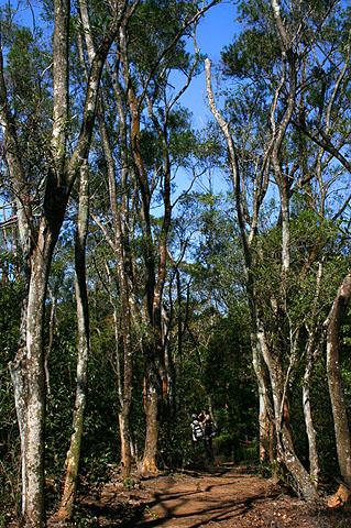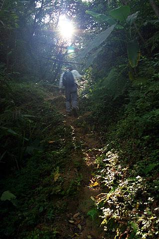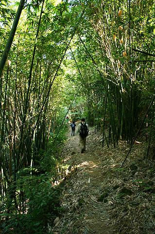 但是如果沒有好好測光的話,拍出來的近物不是過暗,就是背景會過亮。我已經很習慣之前那台DC那種對焦與測光一次解決的方式,反而對於400D的測光與對焦分開不太習慣,因此在穿過二層坪古道有一段綿長竹篁間精采路段,內部幽暗與外部明亮對比強烈,如何將這份幽邃的翠綠情境忠實地表現出來呢?這時老恩兄又將在這種情境下所需要的測光與曝光補償的方式演練一遍給我看。