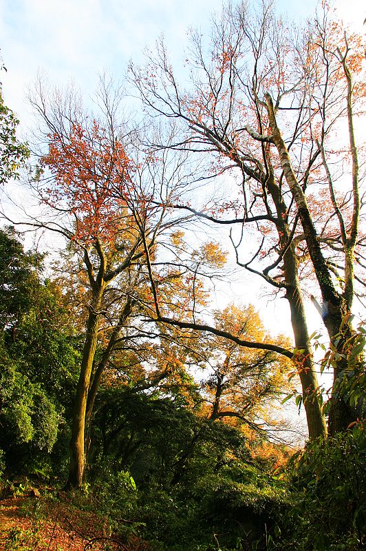 所謂的「苔隱心徑」(陽峰古道上段)的入口應在產業道路反光鏡出口處還要再往下坡走,我本來就是提前從水圳路鑽出來的,未完全按照Lee兄的路線(Lee兄的路線,出口的對面應該就是石階步道的起始)。由於天色已暗,雖然苔隱心徑這條石階步道兩旁也有大楓樹,不過也已無法取景,只見滿地落葉。