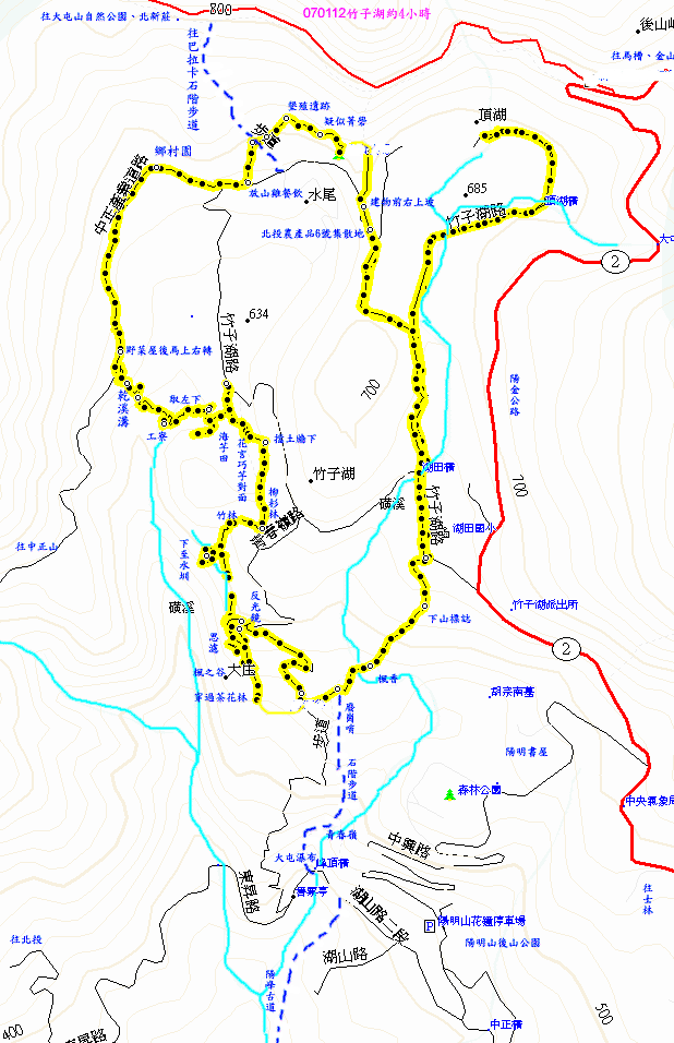 1.從陽金公路進入竹子湖,隨後到了湖田國小,湖田國小的左側那條進入竹子湖路某某巷的柏油路是環形路線回來的路。