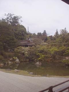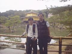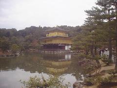 從二條城沿著丸太町通(西向)、西大路通(北向)往金閣寺﹔當然是坐著巴士,不敢再用走的,昨天真的走太多了。後來進到金閣寺的週遭,四周林木清新、氣氛幽靜,午後太陽躲在雲後,整個感覺涼爽起來。金閣寺的歷史是足利義滿時為了炫耀??所建造,銀閣寺則是他的兒子仿效之作,詳細歷史...自行翻書看看吧。等到真正看到金閣寺,真是金碧輝煌,光彩奪目,整座樓閣以金箔裝飾而成,如果午後的光線再強些,一定會光彩奪目令人不敢逼視。尤其是金閣寺在湖中的倒影與金閣寺本身輝映成趣。從各個角度取景攝影都是美。