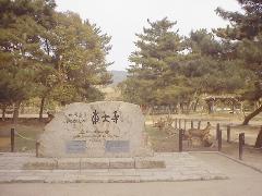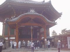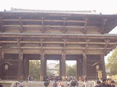 至於東大寺是佔地非常寬廣的大寺院。我們由興福寺沿著登大路往東走回就來到奈良博物館對面的東大寺大佛殿的入口,由入口再走到大佛殿還有一小段距離,這裡的學生與鹿也是非常之多,應該可以說是滿山遍野的到處亂跑的多。這條路旁還有一個湖與其湖上周圍的庭園造景,這大概又是哪一位天皇到此一遊的傑作。不過在夕陽西照湖面,千條金光閃閃之時,道也算是不錯優雅景緻。南大門是一個很大的的山門(見照片),不過進了南大門,卻還必須再走一會兒,才能進大佛殿的山門。進了大佛殿的山門(料金:550圓),再走過庭園前的大道,才能進到大佛殿,這時一尊非常之大的毘盧遮那佛像(所有佛都是此佛之化身)。當然這又是國寶,連佛像之下的蓮花座蓮花瓣都有縮小版的展示說明其構造細微之處。總之非得親自來此才能知其大、讚嘆著作工匠之巧思。至於佛殿左側後方的柱子底部竟然有一小洞,可容一人鑽過,所以在場的學生自然不會放過玩耍的機會,在這個洞來回鑽進鑽出。一旁看的我倒覺得這樣的情形很像孫悟空在如來佛面前還是不脫淘氣之本性。由於學生太多,讓週遭紀念品攤販的買氣感覺大增,這裡的紀念品不是單純的護符而已,還有背後是溫度計的東大寺紀念、透明夜光小鹿(大概是奈良特有的紀念品)。不過很準時的五點半大佛殿的門又要關了,於是本來在寺內買紀念品的學生,一窩蜂的跑出了大佛殿,三五成群快快樂樂的到寺外追著鹿玩去了。真羨慕年輕人臉上洋溢著那種單純的快樂笑容。