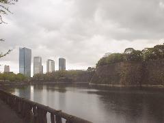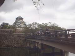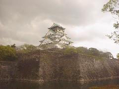 由於下午雨已幾乎不下了,所以我們決定去參觀大阪城(Osaka Jo)與其天守閣。大阪的地鐵四通八達,我們的路線主要是以谷町線至天滿橋站下車,出了車站應該是在大阪城的西北方。其實在路上走著還沒到大阪城之前,眼中所看的都是車來嚷往,與趕工中的工事(與大阪要爭取2008年奧運有關)。對於處處施工的噪音與鷹架等有點錯覺,好像回到了台北當時在興建捷運板南線時的忠孝敦化。後來看到大阪城的城郭與護城河環繞的週遭廣大的綠地,才漸漸又被拉回古老的歷史記憶的感覺。不過似乎有一點不協調,(見相片),在大阪城東北角,有幾棟大廈,包括大阪商業大廈與Twin Towers。不過隨著越深入大阪城,翠綠的庭院森森,幽深蜿蜒的內外城之間的巷道,大阪城的內部就像是一個與外部隔絕的島嶼。