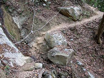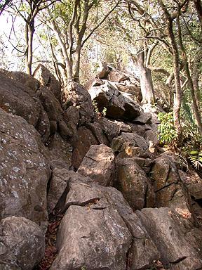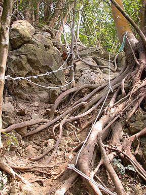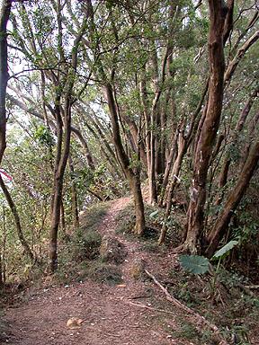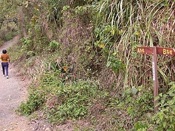 桶頭步道分成A、B路線上山。A線幾近垂直的陡上一百公尺,老媽何曾經歷過這種陣仗?爬不了多高,就倚在樹根旁休息,每一塊岩石都是挑戰,每一段易滑的砂石坡都是危機。於是一路上便開始怨聲載道,說為什麼要找這種路線來走?本來應該不會爬很久的陡上坡,就這樣在步步驚魂之下似乎走得無窮無盡。