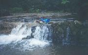 如果有一個傻蛋坐在大石上忍受瀑布沖刷修練武功,就會很像武俠小說的場景。沿著左邊小徑繼續往上爬,就會看到山崖中間有一個凹洞,這凹洞還一直延伸到瀑布後面。凹洞旁還擺著一塊牌子與一袋年代久遠的垃圾,牌子上寫著的是瀑布小姐的留言,留言內容大致上是說:我是瀑布小姐,我在也無法忍受你們這些遊客來此遊玩後卻不把你們製造的垃圾帶走之類的話。