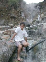 進入山谷,遠遠的就看到冒著煙的溫泉瀑布。就近溪水試了一下水溫,此處的溪水已經不會那麼燙人。剛才看到的那三個人正在用水管從另一處瀑布溫泉引水到他們所挖好的水池。山谷的岩壁,因為各種金屬化合物的關係,在硫磺溪水的沖刷下,顯現出漂亮的色彩。至於這裡瀑布的水量聽說有些時候是會更大些,總而言之,在這裡泡溫泉是視覺與身體皮膚的雙重享受。不過沒帶衣服的我們只能泡一泡腳。
