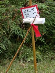 這根竹竿插在梯田旁,上面掛著牌子寫著鹿堀坪,每個登山隊的登山條也都掛在這裡,看來這裡就是鹿堀坪的終點站了。不過對我來說,我關心的是,到底往磺嘴山和往富士坪的路在那裡?