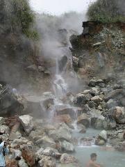 姑且不去想這裡未來會如何。火庚子坪的野溪溫泉,除了有紅色小蟲算美中不足外,其他的都很好。本來有人還心存顧忌不敢下水,後來看我泡的舒服,就也下來了。竹科美女們,也因此陸陸續續換裝下水,煙霧瀰漫中美女入浴;而美不勝收的是 美女....背後五顏六色的溫泉岩壁 。至於溫泉SPA,水溫稍高。敢嘗試者少;習慣水溫之後,也才能享受溫泉水流沖激的舒服。還是感謝竹科登山隊,借其更衣帳更衣,也就不用再施展麻煩的雨衣換裝術了。