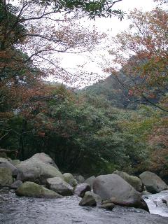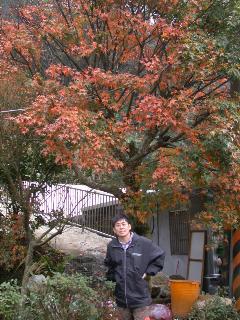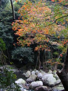廟祝大人說:八連溪谷雖稱紅葉谷,其實風景也還好,真正精采的是八連溪其他上游三處支流,沿山而走最後出北海福座的那一條路上(我猜應是北七經圓山頂的公路;正好呼應三個禮拜前當地人所言),是楓聚集之處。另有一處,綁有登山布條,為至伏流瀑布之路。所謂伏流瀑布者,因其遍尋瀑蹤無著,但聞水聲且覓處,乃知伏流之水從地底湧來....。真是古道熱腸的廟祝大人。從他那裡又知道了不少好去處。