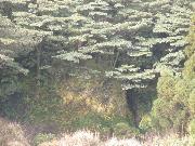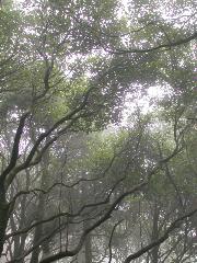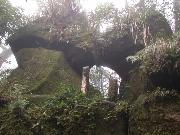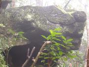 退回聖陵之上,路(往恐龍接吻的路)右側還有其他路跡,取其一叉路而行,不久即見烏龜頭形巨石,石上的紋路看似人為又像天然生成。過巨石後,來到林相優美之樹林中,霧迷濛,平添淒美。但往前之路前途窄且多箭竹。於是原路退回,此時才見右側又有叉路,往古墓,與其上為神仙位。