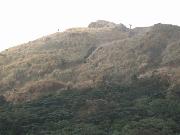 等霧散的更開,而前方樹林下即可望見聖陵石壁,而右上方山腰中間即為神仙位之亭。而更遠之後方是七星山主峰,山頂上的人與指標都看得清楚。這時方知此處位置在主峰與南峰之間,而小油坑登山路線是在左上方。方才誤以為是主峰的右方山丘,實為苗圃路線經過之處。