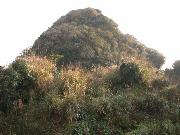 回到半月池附近找尋金字塔何往。左側明顯山徑似接苗圃線,取右線過草叢,不久地上有一窟窿,前方霧朦朧處,隱約可見錐形山丘。往前再走,接近山丘,此時霧漸散開,從右方上山丘,見南方不遠處有十字架,而正下方為廢棄屋。上得金字塔頂,視野頓時寬廣。左方有一更高之山丘,猜其為七星南峰。而金字塔右方之山丘,初以為是七星主峰,後來霧更散後,才知是誤認了。