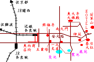 大概是世運覺得在奈良路走的不夠多吧,我們竟然是從東大寺走到奈良市區吃晚餐。事實上我們好像別無選擇,在東大寺附近實在比較難找到吃的。沿著登大路一直往西走回到近鐵奈良線車站,這裡就是奈良最熱鬧可以shopping的東向商店街。這裡賣的與吃的東西各式各樣,我忘了當時好像要吃一種日本料理叫...來著,不過選著選著竟然最後還是吃親子ㄉㄨㄥˋ。在這裡逛街差不多有一個半小時,讓我發現了日本廁所還是有髒亂的一面。這是我第一次發現公廁是不通,水滿溢,大大的...(太噁心了,略)浮在上面,用過的草紙丟了一地。不過這裡的紀念品倒是比較多樣,古式與現代都有,真是要坑殺觀光客的錢包。反正在紀念品加上奈良的字樣、大佛、鹿等圖示,就會賦予原本已經很小巧精緻的小玩藝兒一些額外的紀念意味。所以在這裡大肆的採購和果子、紀念品、茶等,不過後來覺得其實大阪因為物品種類多,其實反而會比較便宜。在逛街途中走著走著,又聽到台灣的口音,有兩個女孩在對話吧:得趕緊回去,不然旅館就沒...。我很認真的在猜到底不早點回去會沒什麼?現在也才不過七點半。是沒公車?還是旅館會沒熱水?不管如何,我們也得趕緊回去,不僅因為商店街已經在廣播即將休市,而且還因為我們到奈良還沒到旅館check in呢。後來回到奈良車站附近搭車,果然公車少了許多,巡迴公車已經不開。而等我們搭車回到跟中午同樣下車的地方(東大寺與春日大社之間),附近早已一片漆黑。一邊跟中午一樣走上坡,一邊在想,方才活蹦亂跳的鹿,現在都跑到哪去了?後來在春日大社停車場附近,果然還看到一隻鹿,在夜晚路燈的照耀下,眼睛顯得分外明亮的看著我們。一路上路雖暗,不過倒也不寂寞,因為世運正在滔滔不絕的說一個我已經聽過的黃色笑話。我心想右邊就是東大寺的大佛殿,而且這幾天我們拜訪過的佛寺也不少,怎麼心靈卻沒有被洗滌乾淨?於是我"很純潔"的問說:那為什麼故事的結局是舌頭被切掉呢?手指會不會也會不見呢?為什麼?到底是為什麼?裝傻的同時,走著走著我們住的花園旅館到了。