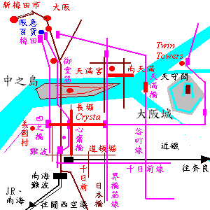 由於下午雨已幾乎不下了,所以我們決定去參觀大阪城(Osaka Jo)與其天守閣。大阪的地鐵四通八達,我們的路線主要是以谷町線至天滿橋站下車,出了車站應該是在大阪城的西北方。其實在路上走著還沒到大阪城之前,眼中所看的都是車來嚷往,與趕工中的工事(與大阪要爭取2008年奧運有關)。對於處處施工的噪音與鷹架等有點錯覺,好像回到了台北當時在興建捷運板南線時的忠孝敦化。後來看到大阪城的城郭與護城河環繞的週遭廣大的綠地,才漸漸又被拉回古老的歷史記憶的感覺。不過似乎有一點不協調,(見相片),在大阪城東北角,有幾棟大廈,包括大阪商業大廈與Twin Towers。不過隨著越深入大阪城,翠綠的庭院森森,幽深蜿蜒的內外城之間的巷道,大阪城的內部就像是一個與外部隔絕的島嶼。
